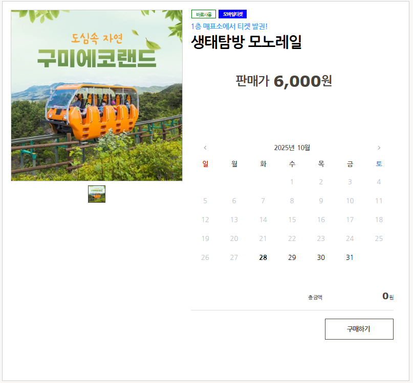 - 구미에코랜드 모노레일은 인터넷 사전 예약과 현장 발권을 통해 이용할 수 있습니다.