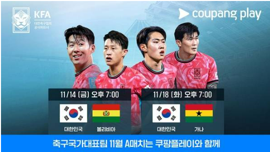 - 쿠팡플레이: 대한축구협회 공식 파트너로 11월 A매치 2연전(볼리비아전과 가나전)을 디지털 독점 생중계합니다. PC, 모바일, 태블릿 등 다양한 기기에서 고화질 중계 가능.
