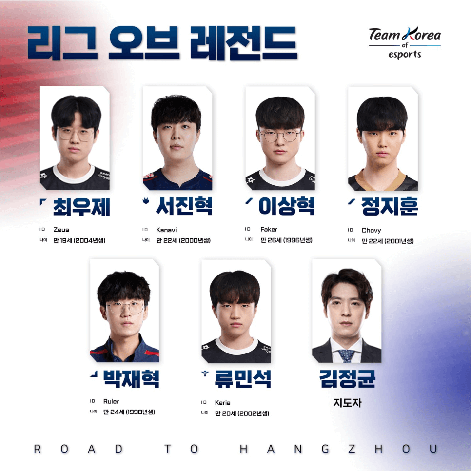 우리나라 대표 선수는 최종 6명입니다. 이상혁(페이커) 선수를 포함한 최우제, 서진혁 등 뛰어난 선수를 포함하여 여느 때 보다 좋은 성적이 기대됩니다.