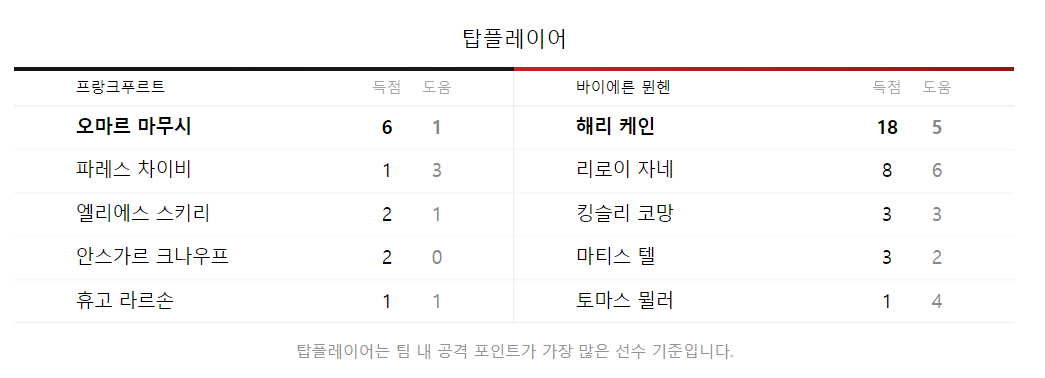 ✅️ 바이에른 뮌헨과 프랑크푸르트 탑플레이어는 해리케인 선수, 오마르 마무시 선수이며, 각각 18골과 6골을 기록하고 있습니다.