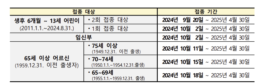 질병관리청에 따르면, 2024-2025 절기 인플루엔자 예방접종은 9월 20일부터 2025년 4월 30일까지 진행됩니다.