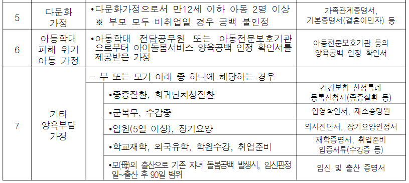 맞벌이가정, 한부모가정, 장애부모가정, 다자녀가정, 다문화가정, 아동학대 피해 위기 아동가정, 기타 양육부담 가정이 포함됩니다.