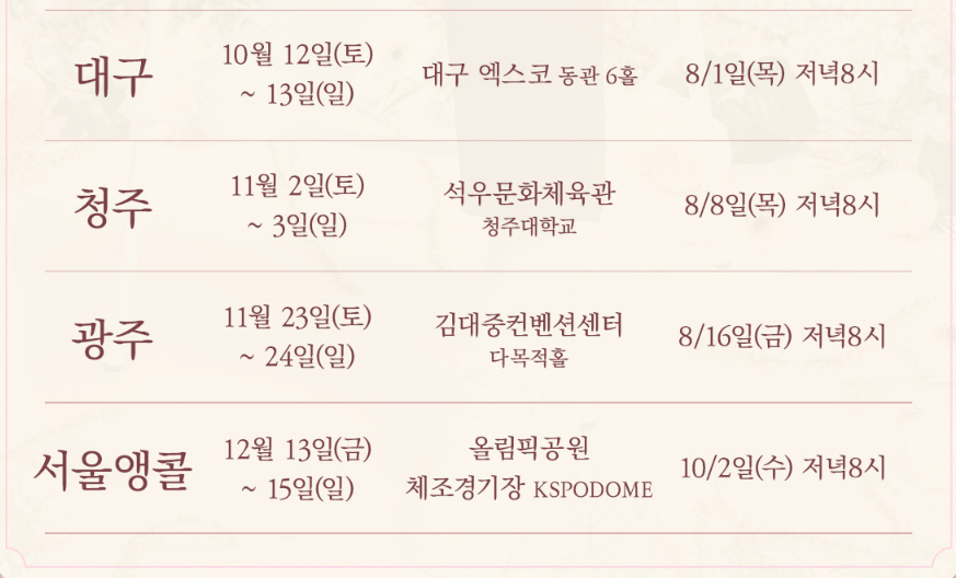 ✔️대구: 2024년 10월 12일(토) 오후 6시, 10월 13일(일) 오후 5시, 대구 EXCO